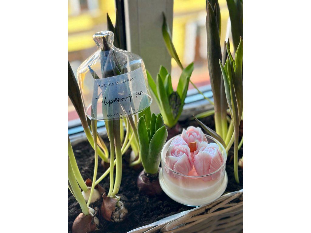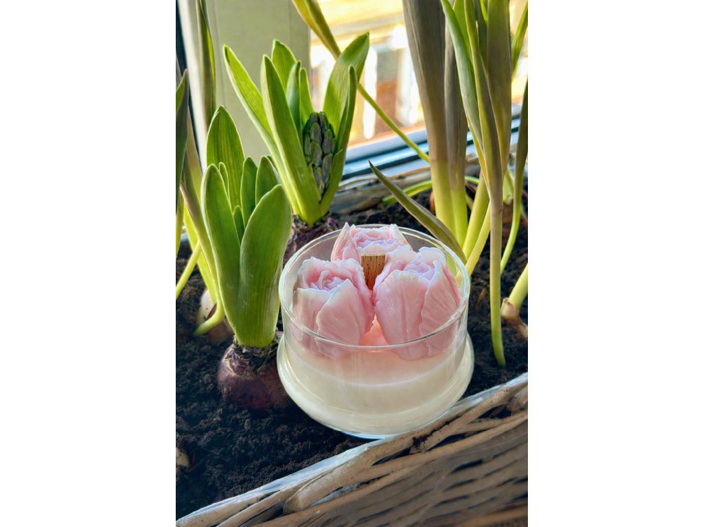 Nechte se unést do rozkvetlé jarní zahrady s touto jedinečnou sójovou svíčkou Tulipánový sen. Voskové tulipány vytváří něžnou dekoraci, která okouzlí na první pohled.